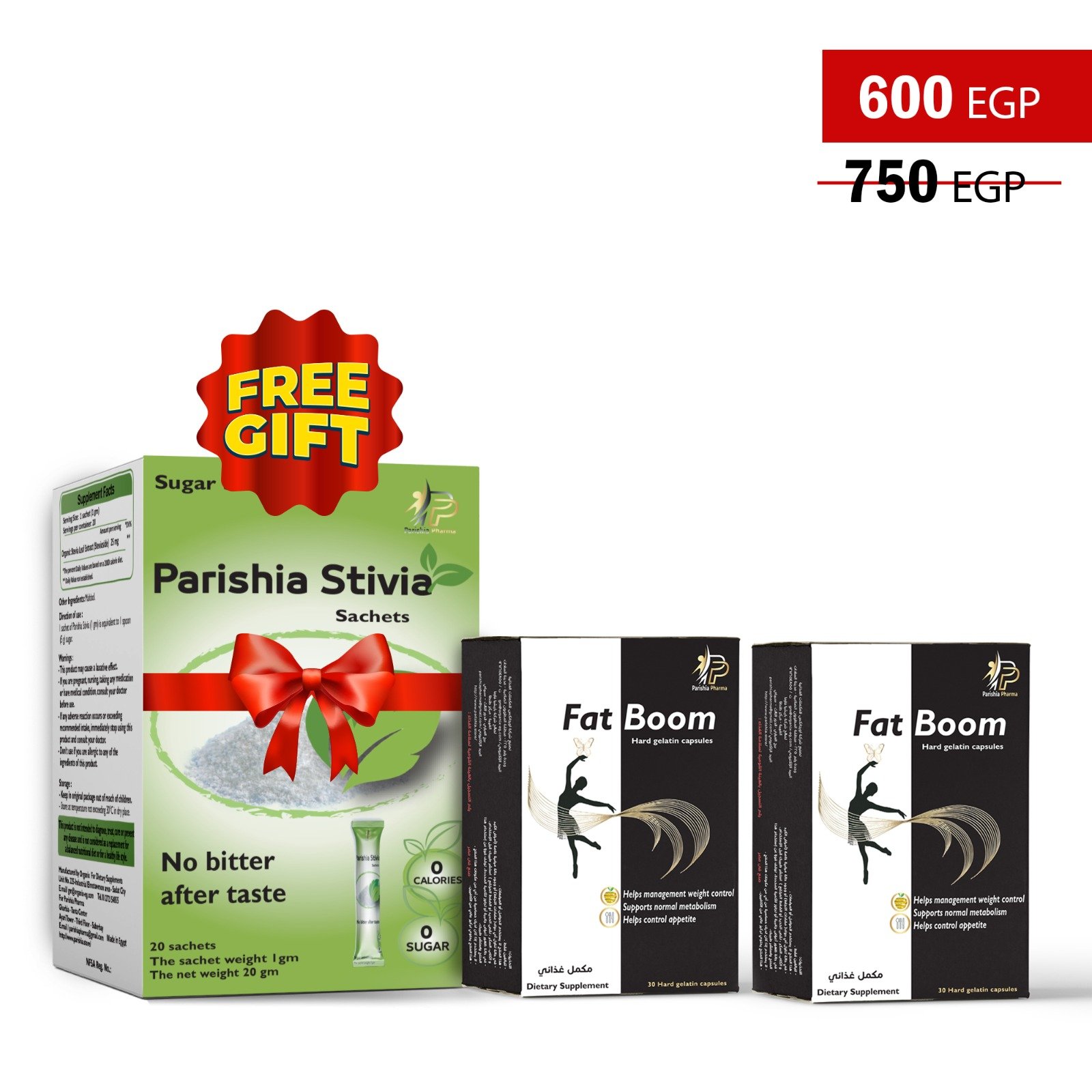 احصل على الدعم الكامل لرحلتك نحو جسم صحي ورشيق مع مجموعة متكاملة تجمع بين 3 عبوات من Fat Boom لحرق الدهون وكبح الشهية، و2 عبوة من Parishia Stivia للتحلية الصحية بدون أي ذنب!